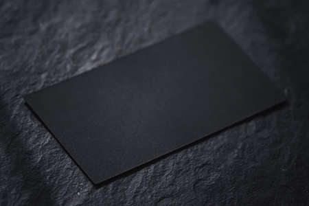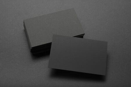 Photo of black blank business cards on a black background. Template for ID. Top view