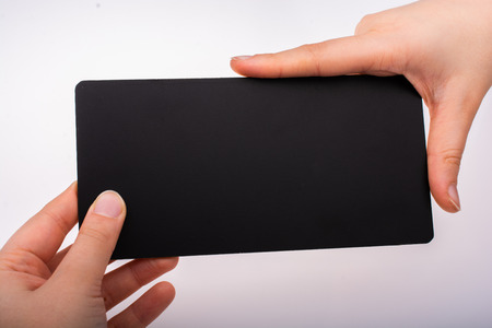 A hand holding a blank black card against a gray background. The card is perfect for displaying your own text, logo, or design.
