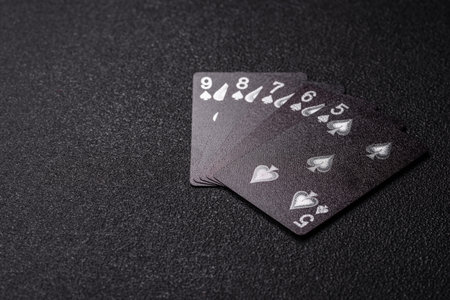 Playing card game poker in casino with chips, bets and risk. Cards and chips on black felt as background for your design