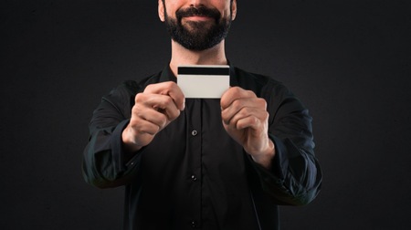Detailed close-up of a bank card in the hands of a man, financial transaction concept