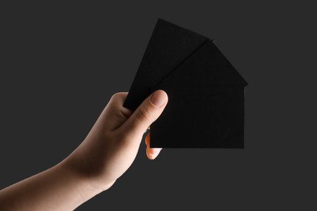 A hand displays a sleek black gift card on a textured dark background, offering ample space for text and custom designs.