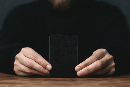 Thoughtful person holding a blank card, demonstrating introspection and creativity in a minimalist setting with a dark background and wooden table