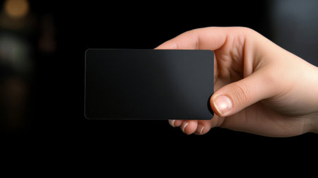 A hand provides a close up view of a sleek black gift card against a dark background, ideal for showcasing custom text or designs.
