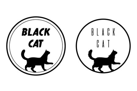 Black cat. Logo, symbol, sign. Silhouette of a running cat. Blank template for design, decoration. Fluffy black cat walks in a ring, circle, side view. Vector isolated