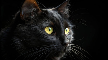 A black cat with yellow eyes looks into the camera, a close-up portrait of a cat on a black background.