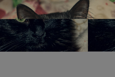 black kitten over black background, portrait of halloween cat with blue eyes, panoramic layout