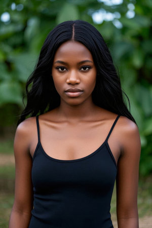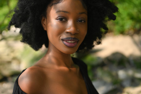 Close up headshot fashion portrait Beautiful young African American Black woman naked shoulders posing outside, sunny summer day green foliage. Facial treatment. Cosmetology, perfect skin care and spa