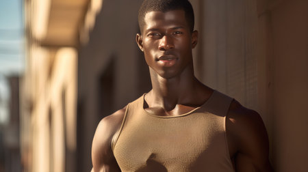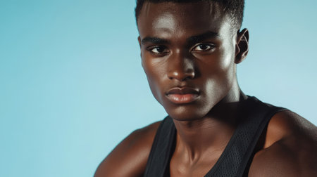 Young man with short hair wearing sleeveless top, looking seriously at the camera. Strong facial features and athletic build emphasize his serious and focused expression