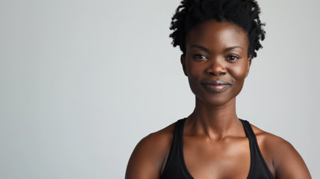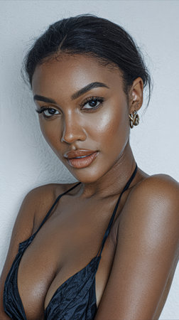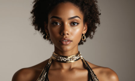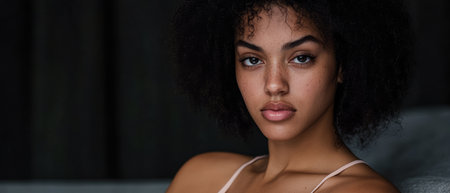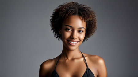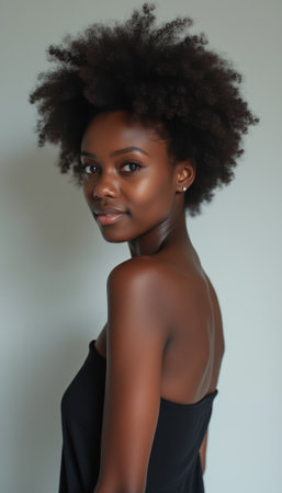 A stunning woman with a beautiful afro hairstyle poses gracefully, exuding confidence and elegance. Her glowing skin and serene expression highlight her natural beauty, creating an inviting and uplifting atmosphere