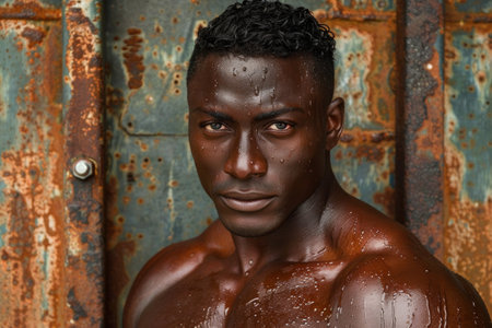 close-up portrait of a muscular man with glistening skin and a determined gaze.