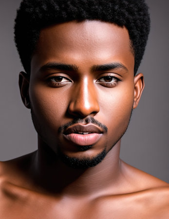 Beauty and skin care Highlydetailed close up portrait of goodlooking darkskinned young man with clean healthy glowing skin looking at camera with serious confident expres : Generative AI