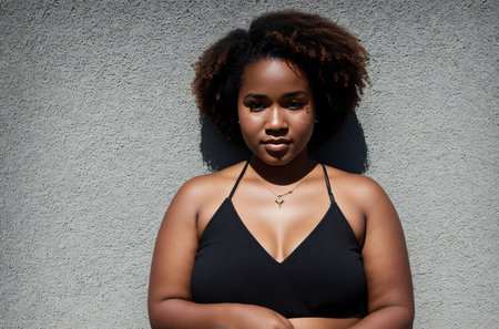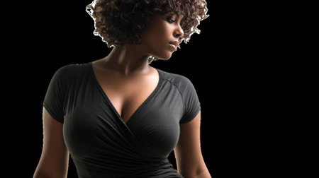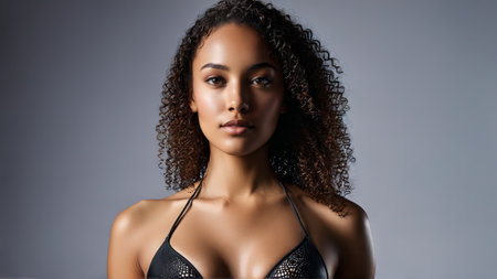 Beautiful portrait of a confident young woman with curly hair wearing black lingerie. She exudes self-assurance and grace, embodying plus-size beauty.