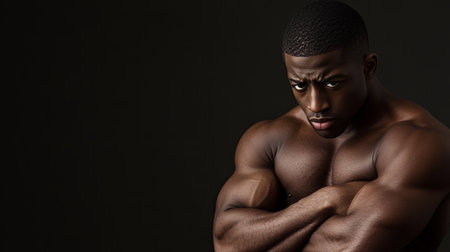 A powerful image of a muscular man flexing his arms, showcasing exceptional muscle definition. This intense portrait highlights confidence and determination, perfect for fitness and strength-related topics.