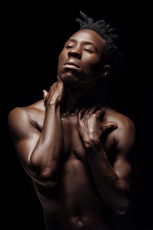African man shirtless with muscular body and serious expression in creative conceptual visual style. Dark skin, portrait with studio lighting and black background for artistic photography.