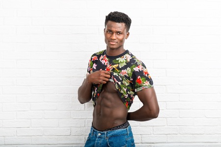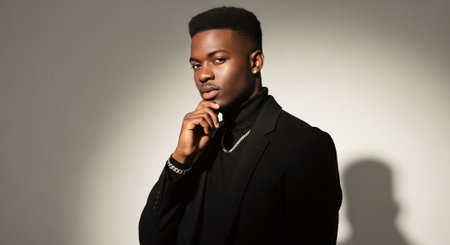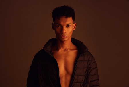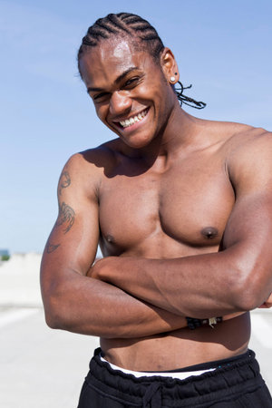 A young, attractive African American man poses topless with a relaxed yet confident expression. His strong physique is emphasized in the well lit studio setting, highlighting his charisma.