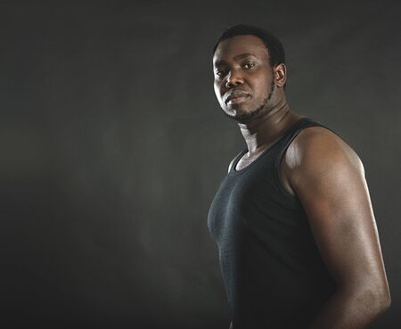 Studio shot of young smiling african man standing isolated on dark background, dressed in light t-shirt.