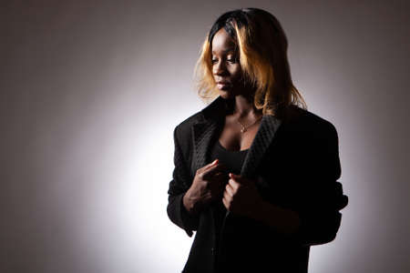The dark-skinned girl considered. African-American woman in a black jacket. The dark-skinned girl lowered her eyes. African-American model with colored hair.