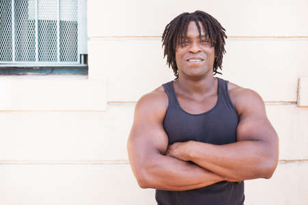 Portrait of a handsome young african man with dreadlocks wearing a black t-shirt and jeans.