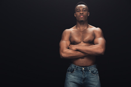 sexy muscular african american man in denim with crossed arms looking at camera isolated on black