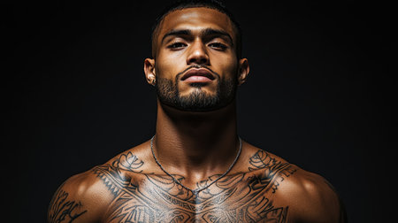 A muscular man stands confidently with visible tattoos across his chest and arms, posing in a well-lit studio. The dark background emphasizes his physique and facial expression, highlighting strength.