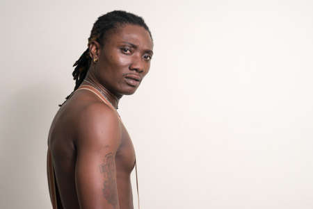 Stressed young muscular African man with dreadlocks looking back shirtless