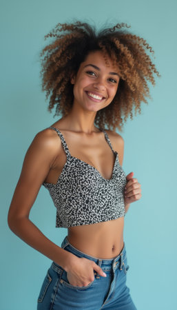 A radiant young woman with voluminous curly hair showcases her vibrant personality while wearing a stylish crop top and high-waisted jeans. Her joyful smile and confident pose against the soothing turquoise backdrop create an uplifting atmosphere, celebrating individuality and self-expression