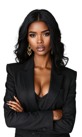 A Black female leader, her posture upright and expression determined, symbolizing resilience, innovation, and the leadership qualities that define success