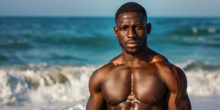 Generative AI : Portrait of an handsome athletic african man at the beach black people concept about people and sport
