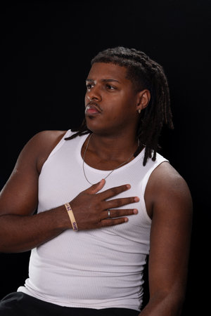 Handsome young man with dreadlocks and a white shirt looking to the side during a photo shoot. Isolated on a smoky background.
