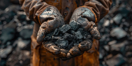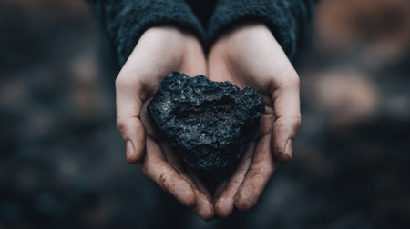 Hands with dirt and grime hold a uniquely shaped heart of coal, illustrating the bond between nature and human industry in a rustic environment.