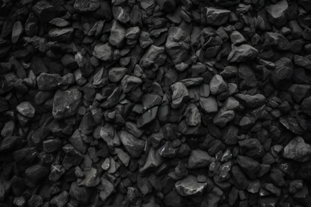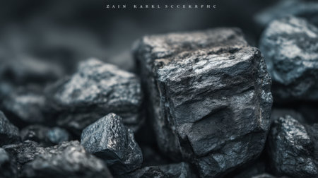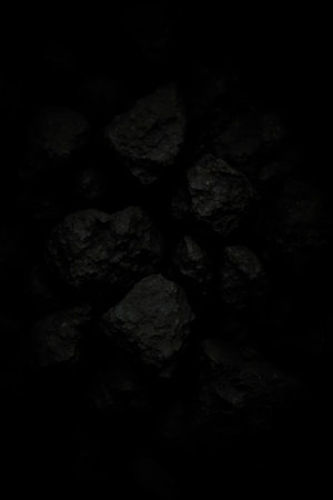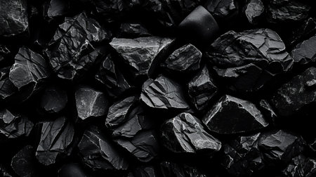 A close-up captures multiple dark rocks with rough, textured surfaces. The grayscale palette emphasizes their depth and rugged appearance. Soft lighting creates subtle shadows. Suitable for illustrating geology, natural resources, or environmental themes. Offers visual appeal for various commercial or editorial applications.
