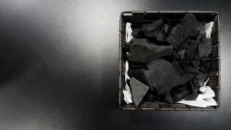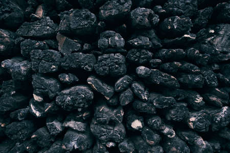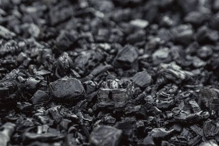 Black Charcoal on black textured floor. charcoal black carbon reesidue produced by strongly heating wood. Used for cooking or other industries. Natural wood charcoal. traditional hard wood charcoal.