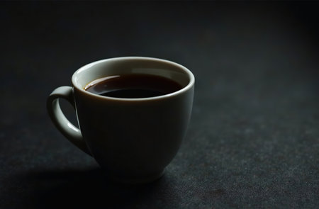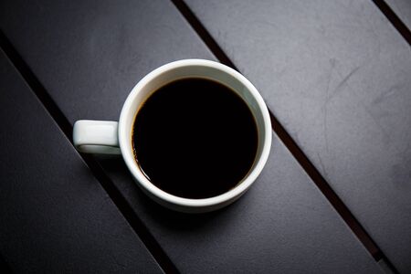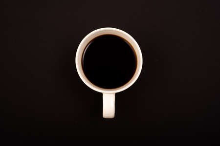 Top view of white ceramic mug with black coffee on black background.