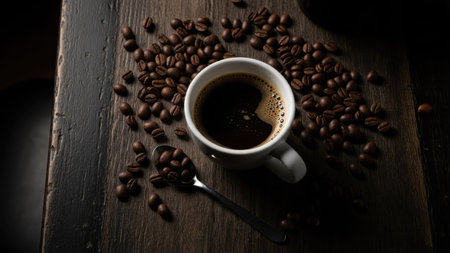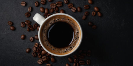 A dark cup of coffee with latte art and scattered beans is displayed.