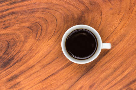 white coffee cup with black drink on wooden table, top view