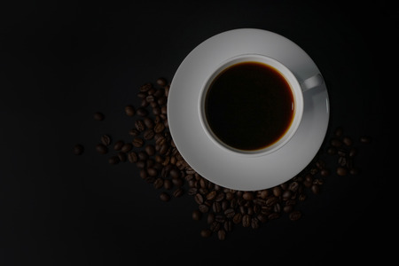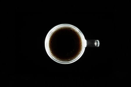 Cup of hot fresh black coffee against black background viewed from top.
