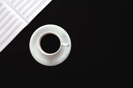 A cup of coffee, a notebook for writing notes on a black background, flat lay.