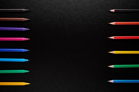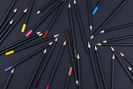 colored pencils on black background. top view close up flat lay copy space. minimalism concept