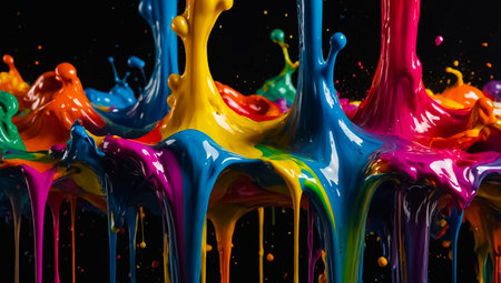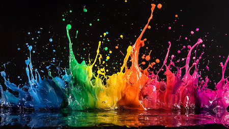 A vivid display of multicolored paint splashing against a dark background, creating a dynamic and energetic scene.