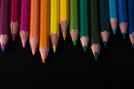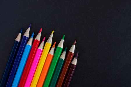 Colored pencils on a black background close-up in macro photography. Art set of pencils with free space.