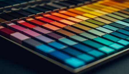 Collection of colorful wooden blocks arranged in a grid pattern against a dark background. The blocks exhibit various shades of vibrant colors.