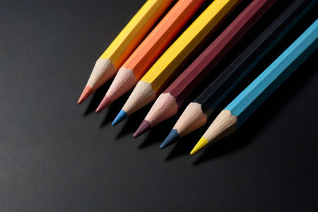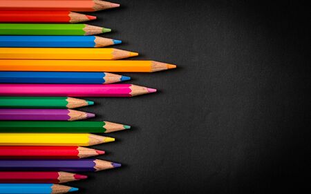Top close up shot of colored pencils arranged in decreasing order of heights shot over black background with copy space on the right