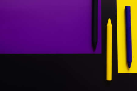 flat lay with crayons on colorful papers on black background