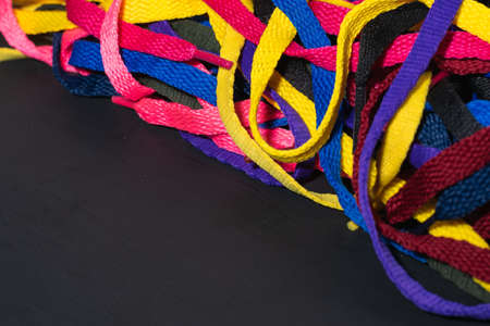 colorful shoelaces background, on black wood, messy, clutter concept, advertisement