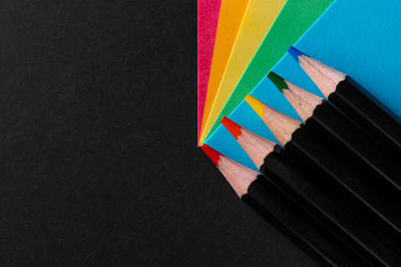 Colored rainbow paper corners and Black wooden colored pencil set on black textured background. Business concept. Layout for design. Copy space. High quality photo