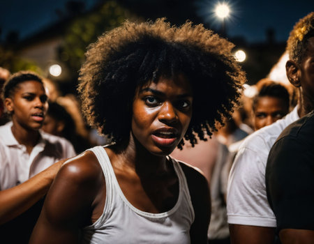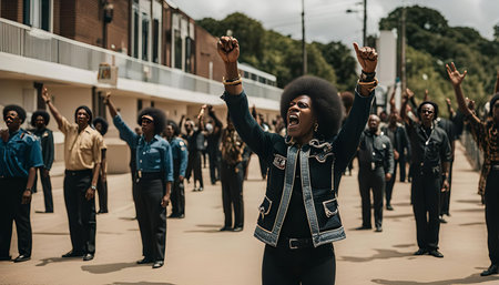 A photo capturing a powerful moment in a large gathering of black people. The image showcases a powerful message of unity, struggle, and hope.