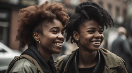 Two stylish African women sharing a close moment, exuding confidence, friendship, and unity, with a pink ribbon symbol in the background.