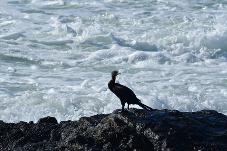 Isolated cormorant water bird standing on a rock by the ocean