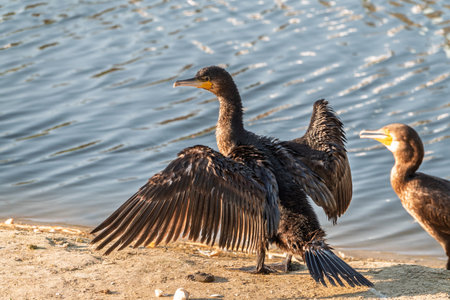 Natural image of Cormorant Phalacrocoracidae spreading wings in sun on river bank