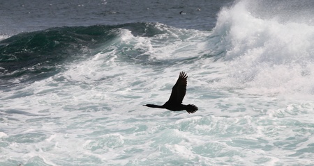 cormorant flies over a raging sea (Commander Islands)